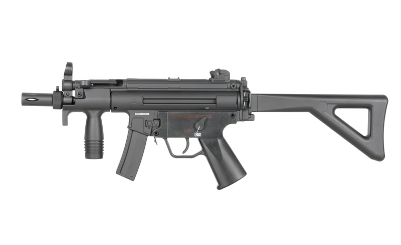 Una réplica 203T de la ametralladora más popular utilizada por grupos especiales en todo el mundo, p. SAS, GROM, GEO, Alpha, GSG 9, Navy SEAL, Delta Force, GIGN. El receptor, el canón, las miras, el disparador del cargador, la palanca selectora de fuego, el gatillo y el cargador están hechos de aleaciones metálicas. La empunadura de pistola, la culata plegable lateral y la empunadura delantera están hechas de polímero. El mecanismo es un Gearbox v3 con sistema de cambio rápido de muelles, engranajes de acero, sistema hop-up regulable y canón interior de 6,03 mm y 130 mm de longitud.